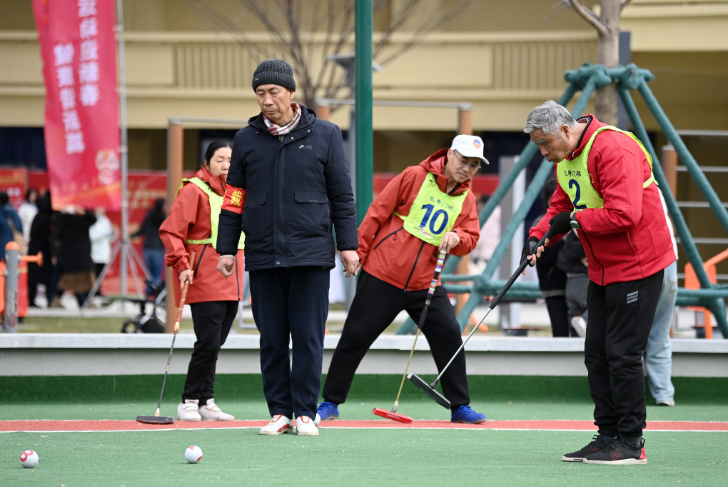 1月15日,“西安年·最中国”2025年全国全民健身大拜年(西安市分会场)系列活动在西安市人民体育场启动。图为市民在改造后的西安市人民体育场进行门球比赛。体育日报记者 李一博 摄