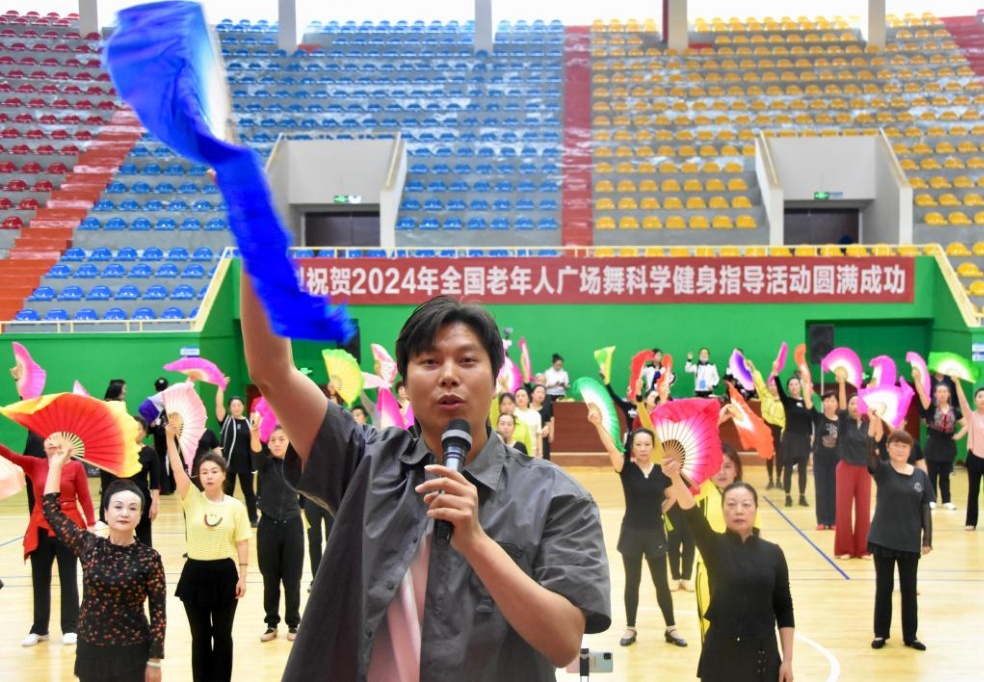 2024年4月9日,2024年全国老年人广场舞科学健身指导活动在陕西省咸阳市举行。图为教练员在给学员培训广场舞套路。体育日报记者 郑昕 摄