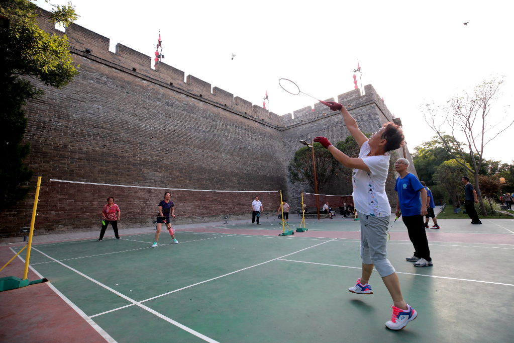 图为2024年6月12日,市民在西安城墙下的环城公园文昌门至和平门段打羽毛球。体育日报发(牛纲摄)