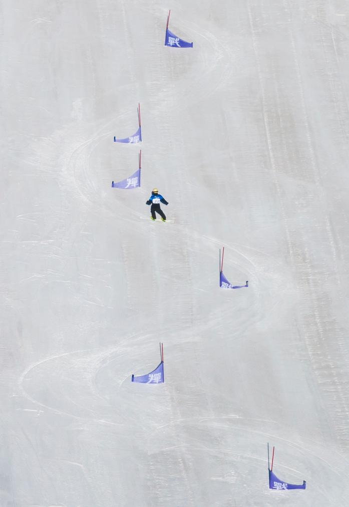 3月20日,内蒙古自治区选手孙铭成在听障男子平行回转比赛中获得第十名(无人机照片)。体育日报记者 才扬 摄