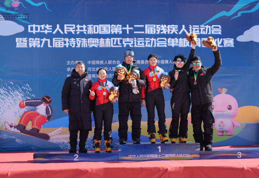 3月20日,冠军河北队选手赵月月(左四)、亚军河北队选手王璐璐(左二)和季军辽宁队选手侯雪梅(右二)在听障女子平行回转比赛颁奖仪式上合影。体育日报记者 邵泽东 摄