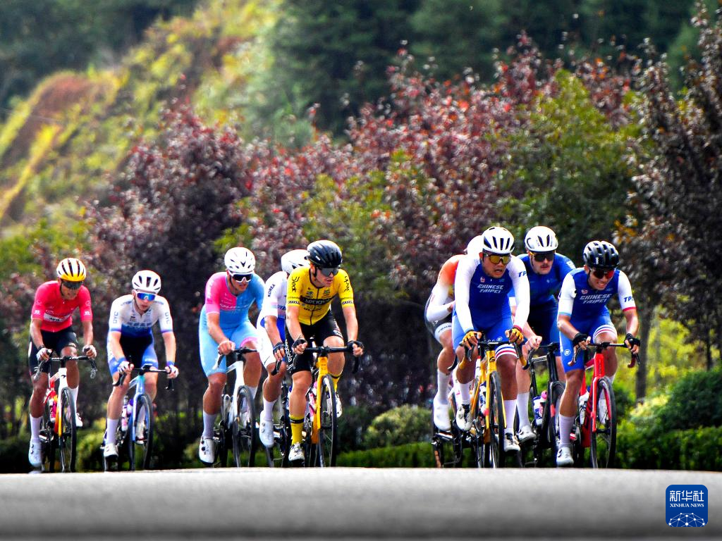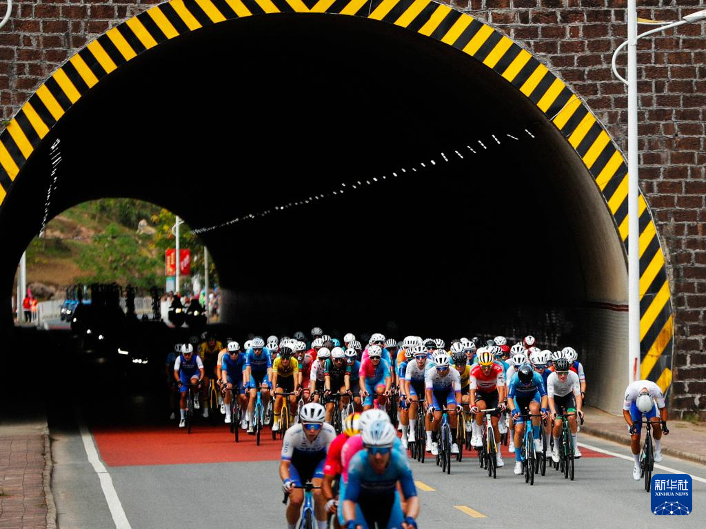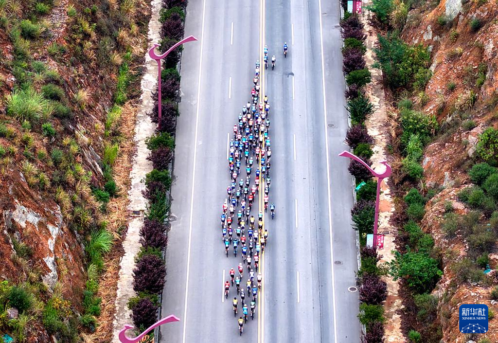 9月22日,参赛选手在比赛中骑行(无人机照片)。