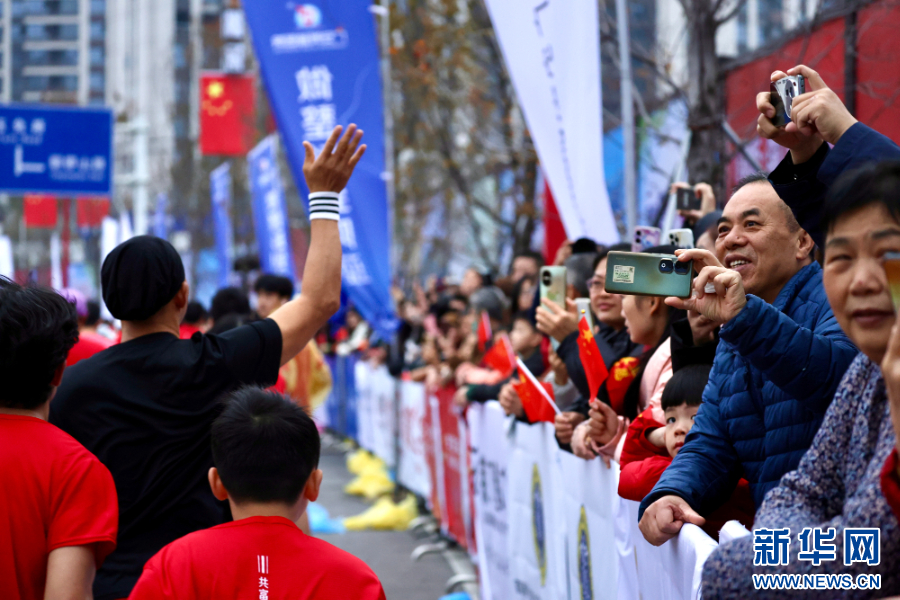 2024年11月23日,观众在道路两侧为参赛选手加油。当日,2024广安马拉松赛鸣枪开跑。新华网发(张可凡摄)