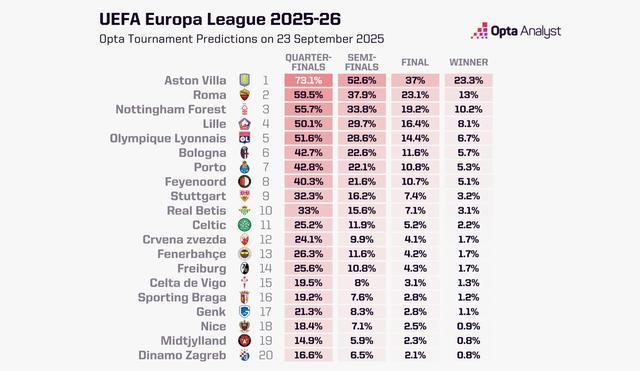 根据Opta的预测,维拉闯入8强的概率高达73.1%,半决赛52.6%,决赛37%,夺冠概率23.3%。此外罗马(59.5%)、诺丁汉森林(55.7%)、里尔(50.1%)以及里昂(51.6%)闯入8强的概率都超过了50%。